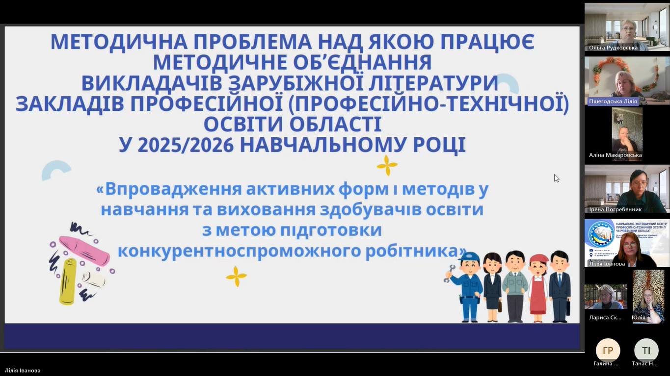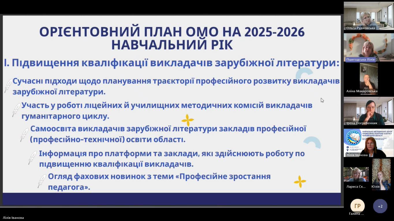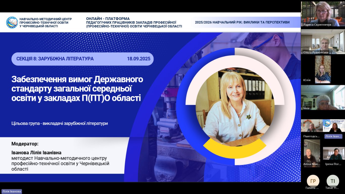Відповідно до плану роботи Навчально-методичного центру професійно-технічної освіти у Чернівецькій області 18 вересня 2025 року в режимі онлайн відбулося секційне засідання викладачів зарубіжної літератури з проблеми «Забезпечення вимог Державного стандарту загальної середньої освіти у закладах П(ПТ)О області».