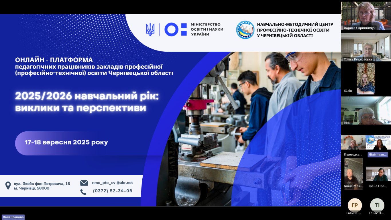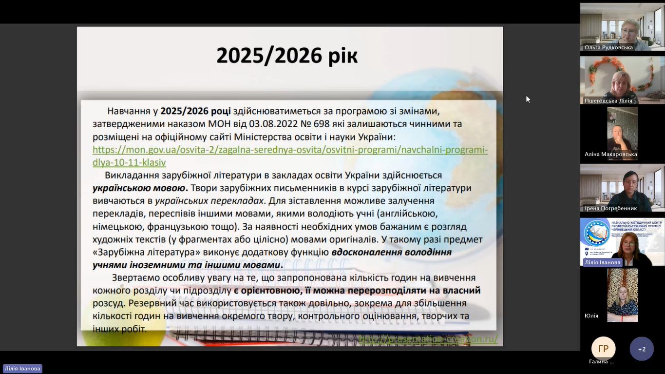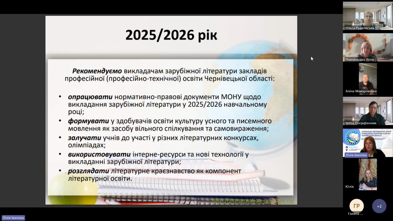 Відповідно до плану роботи Навчально-методичного центру професійно-технічної освіти у Чернівецькій області 18 вересня 2025 року в режимі онлайн відбулося секційне засідання викладачів зарубіжної літератури з проблеми «Забезпечення вимог Державного стандарту загальної середньої освіти у закладах П(ПТ)О області».