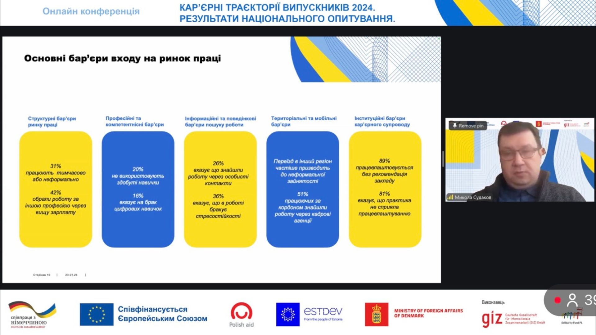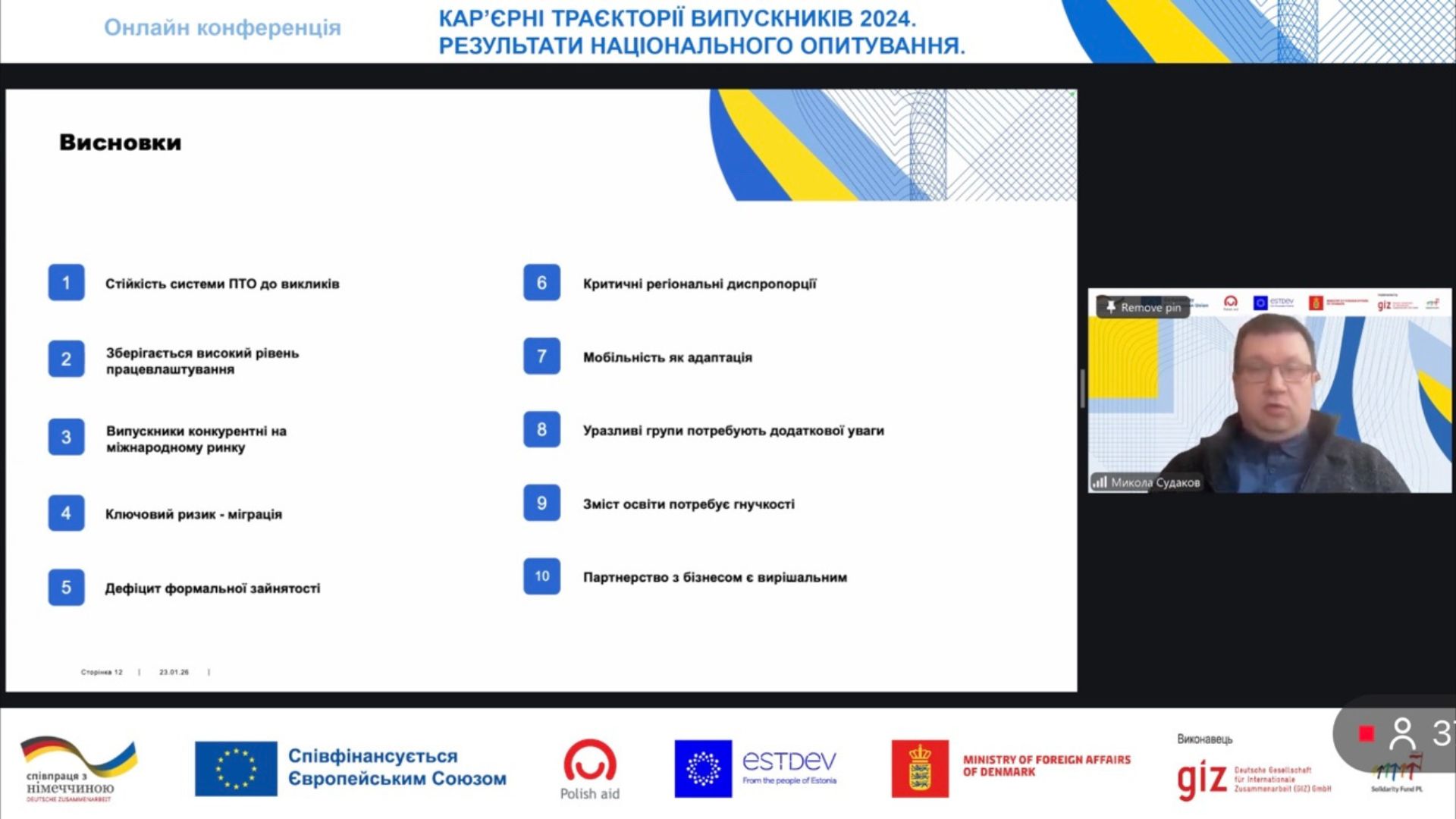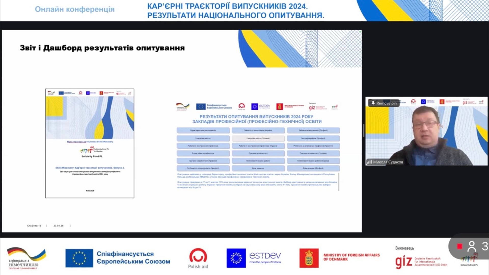 На конференції була представлена інформація про опитування (включно з попередніми опитуваннями 2019, 2020, 2023 років) та національні результати, з якою виступив Микола СУДАКОВ, експерт Фонду міжнародної солідарності.