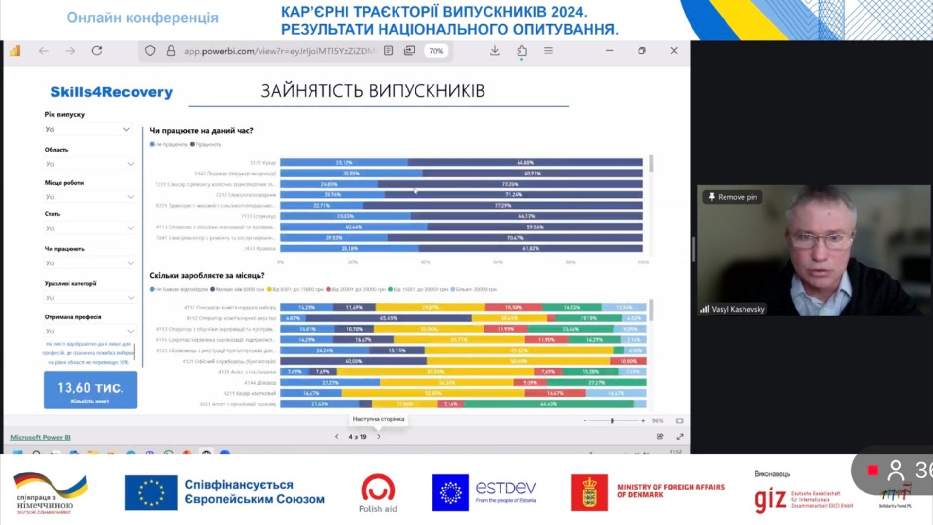 Василь КАШЕВСЬКИЙ, експерт Фонду міжнародної солідарності, презентував дашборд з результатами на місцевому рівні. Продемонстрував, що він може нам розповісти і як можна його використовувати? Це інструментарій дає можливість його використання закладами професійно-технічної освіти та кар'єрними радниками у підготовці молоді до виходу на ринок праці й проведення професійної орієнтації на новому сучасному рівні.