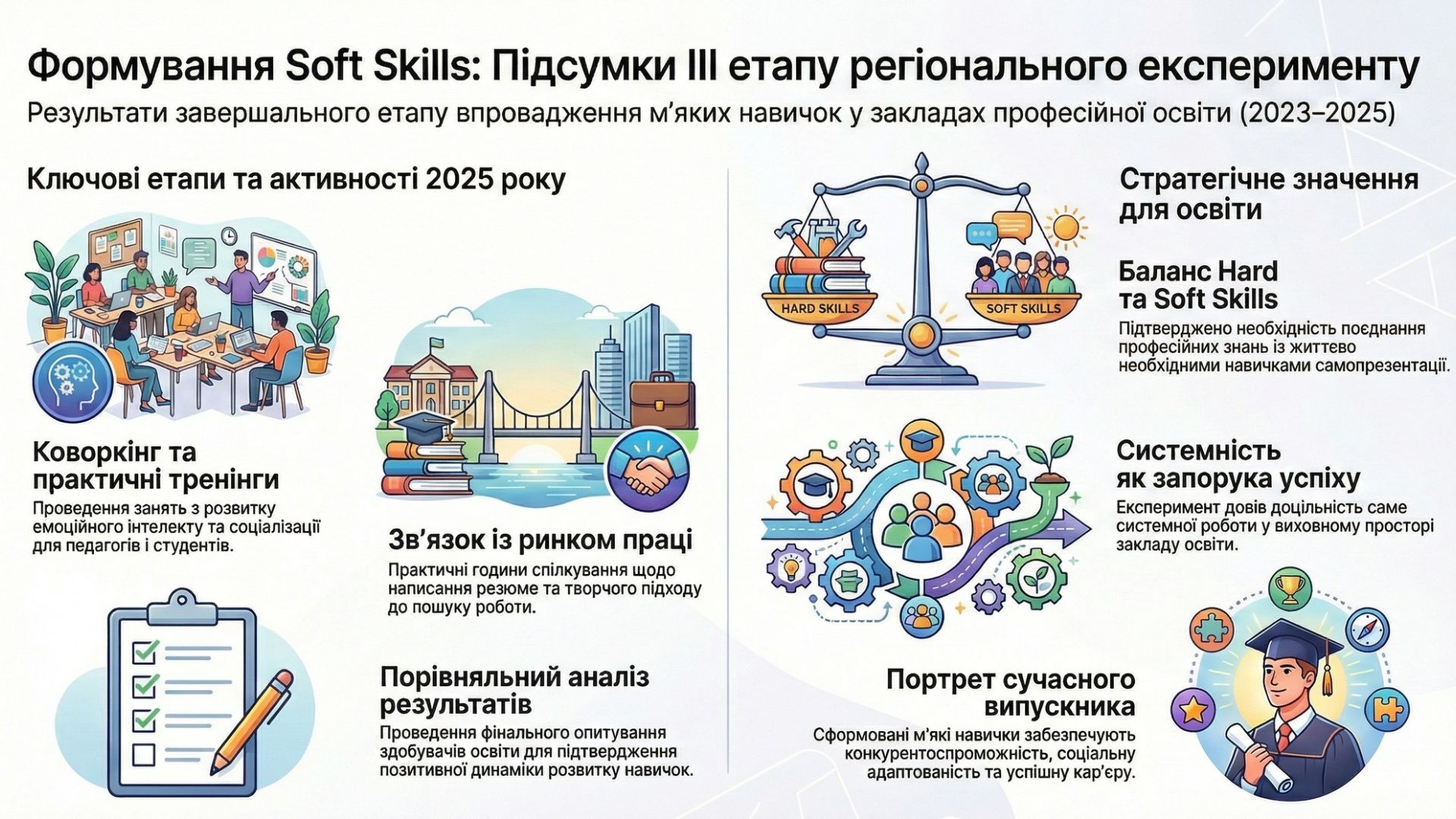 Відповідно до плану роботи НМЦ ПТО у Чернівецькій області на 2026 рік 29 січня відбулася нарада «Про підсумки ІІІ етапу експерименту регіонального рівня «Формування м’яких навичок (𝘀𝗼𝗳𝘁 𝘀𝗸𝗶𝗹𝗹𝘀) як пріоритет у вихованні молоді в сучасних умовах». Учасники наради - творчі групи закладів професійної освіти, учасників Експерименту - ВПУ № 3 м.Чернівці, ВПХУ № 5 м.Чернівці, Чернівецьке вище комерційне училище ДТЕУ та Чернівецький професійний ліцей сфери послуг.