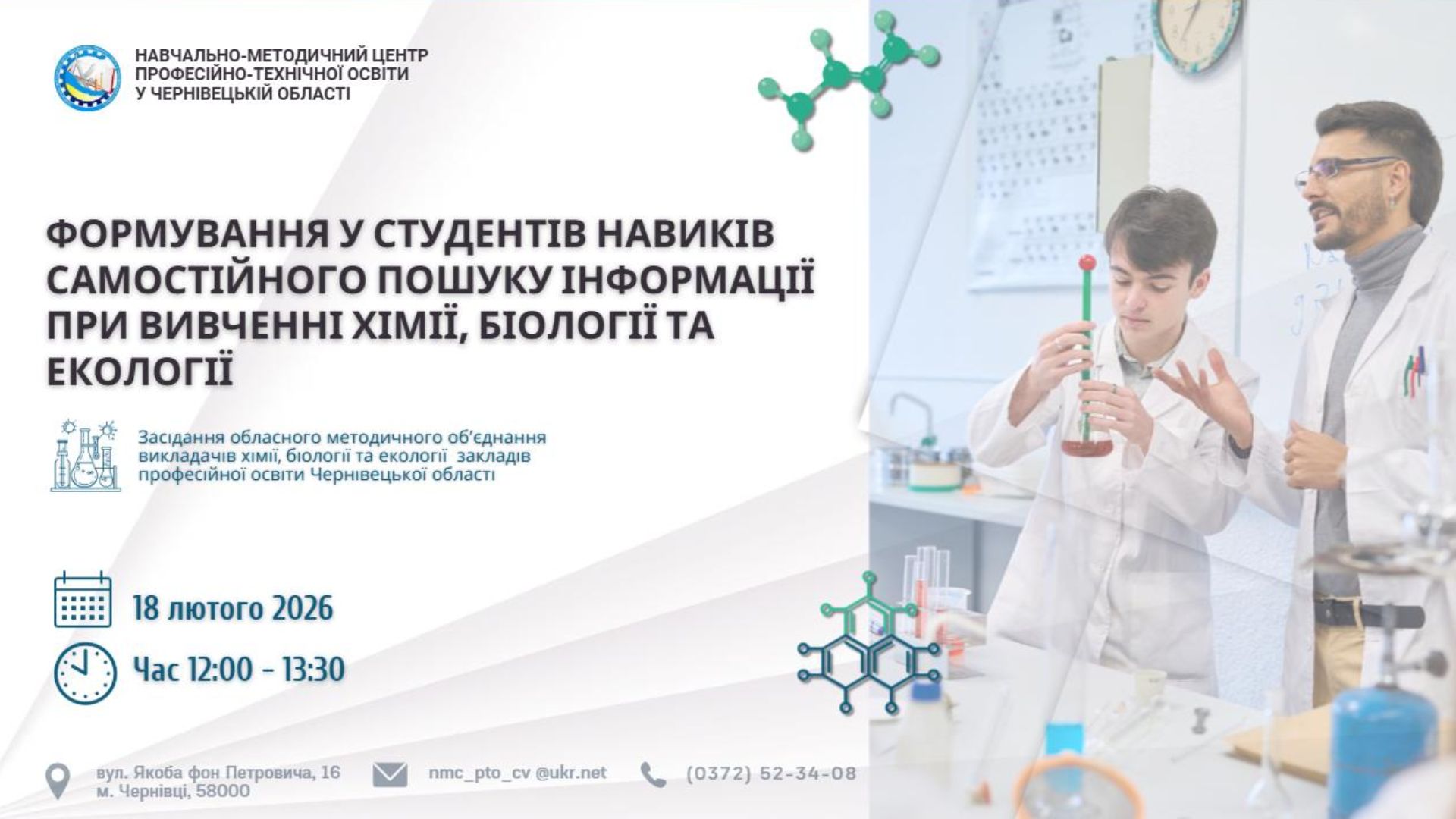 18 лютого 2026 року, відповідно до плану роботи Навчально-методичного центру професійно-технічної освіти у Чернівецькій області на 2026 рік, відбулося засідання обласного методичного об’єднання викладачів хімії, біології та екології закладів ПО Чернівецької області. Тема засідання: «Формування у студентів навиків самостійного пошуку інформації при вивченні хімії, біології та екології».