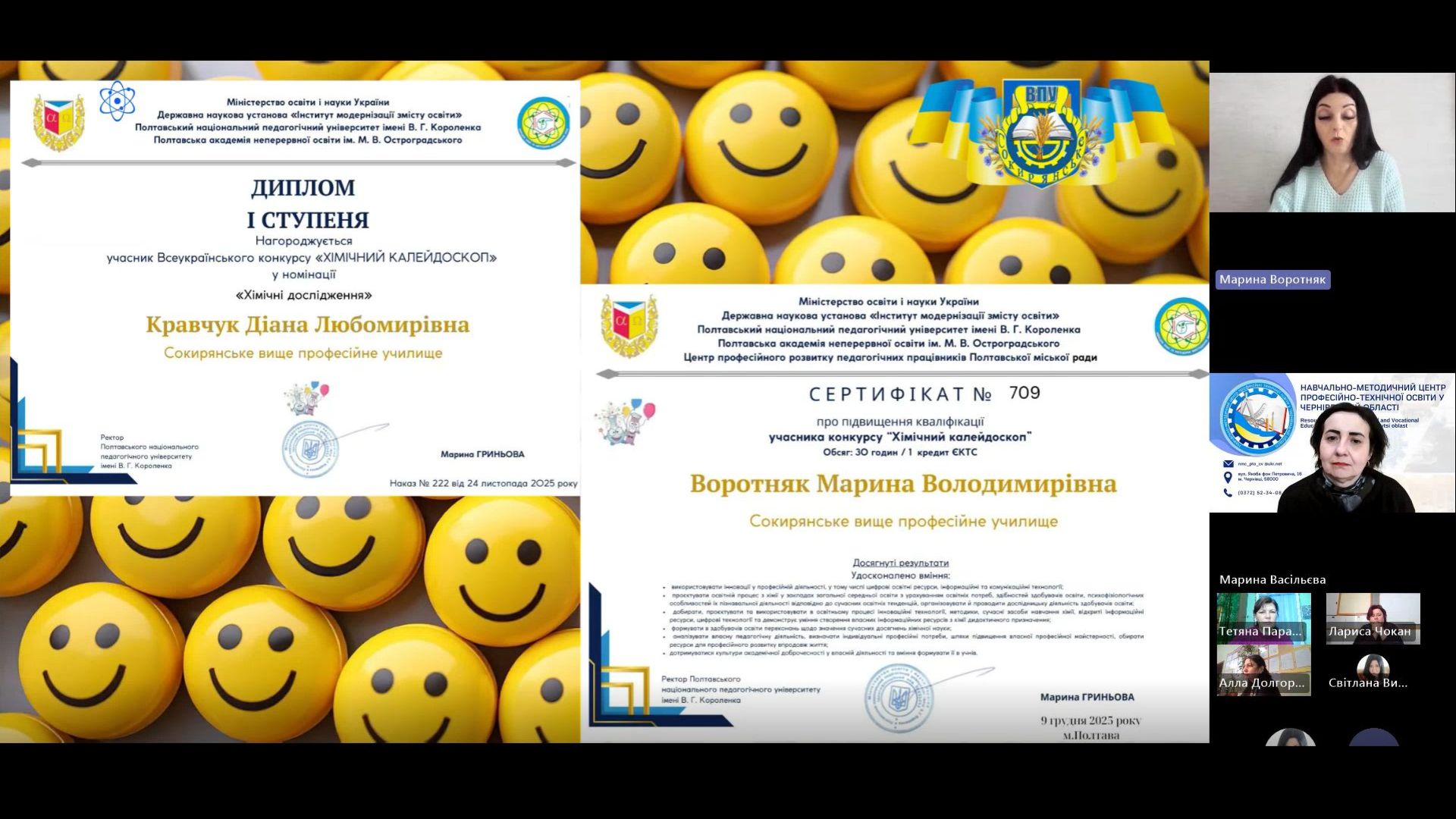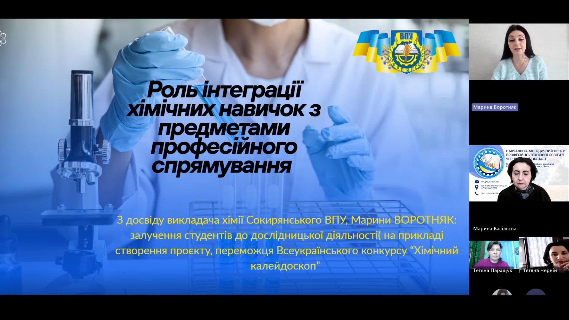 Марина ВОРОТНЯК, викладач хімії СВПУ виступила з темою «Роль інтеграції хімічних навичок з предметами професійного спрямування», а також поділилася з колегами про участь у Всеукраїнському конкурсі «Хімічний калейдоскоп», де було отримане призове місце.