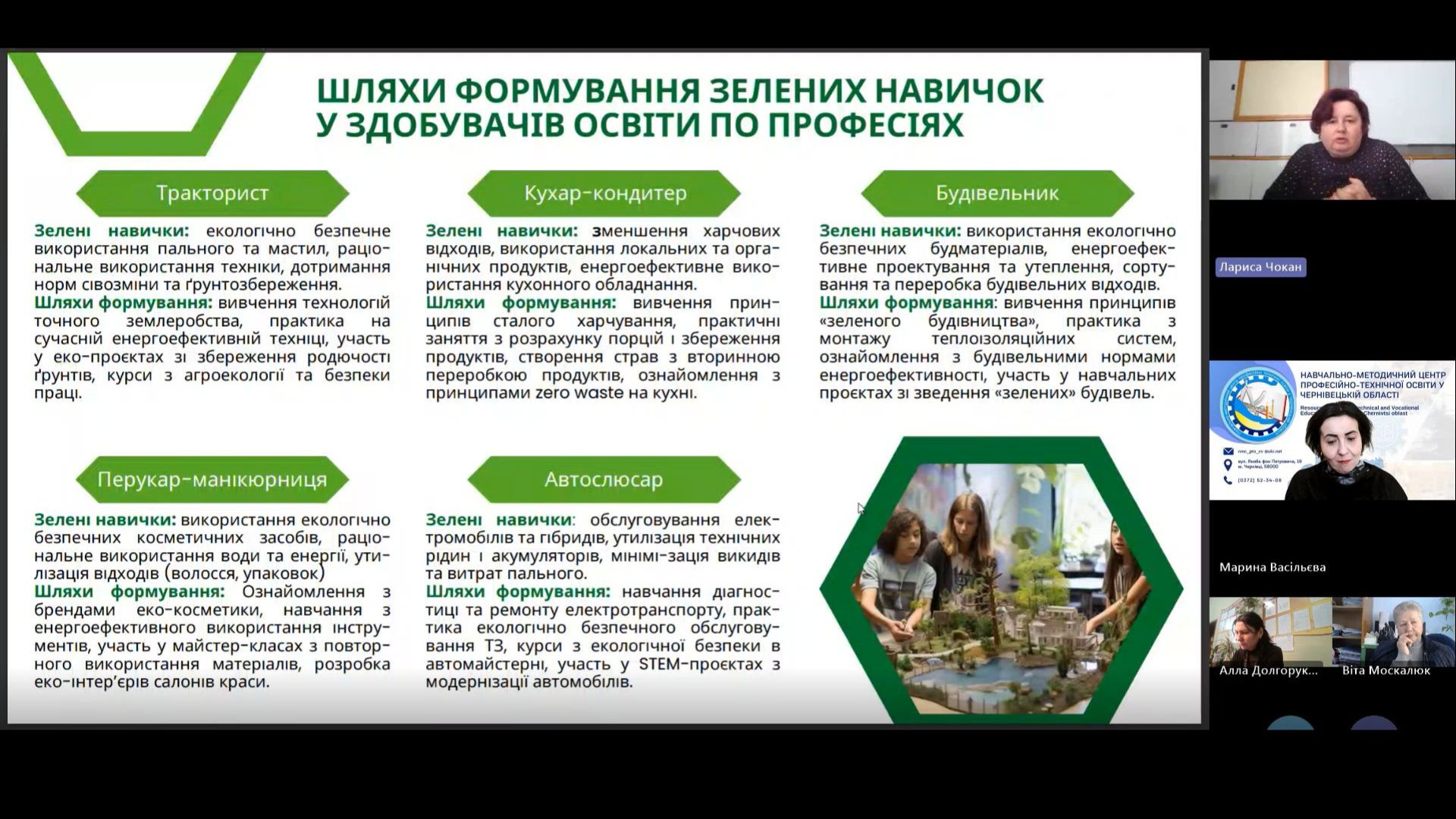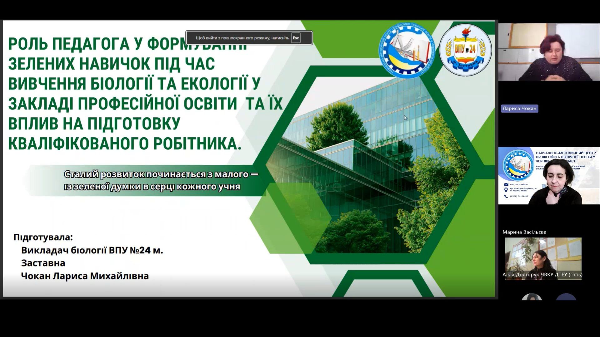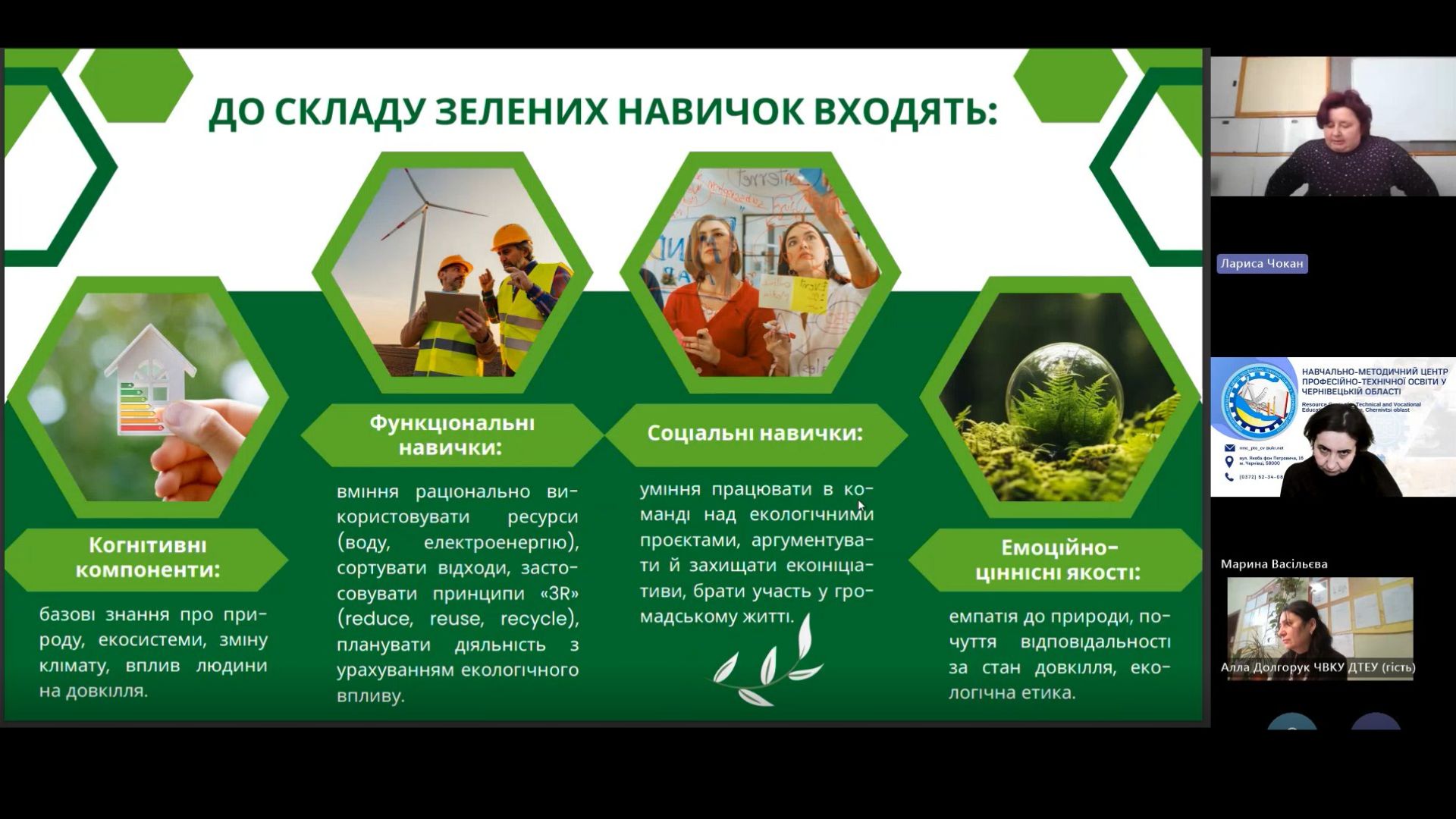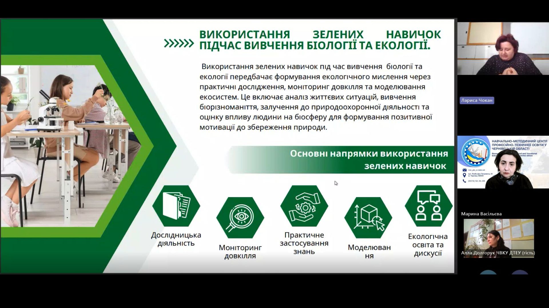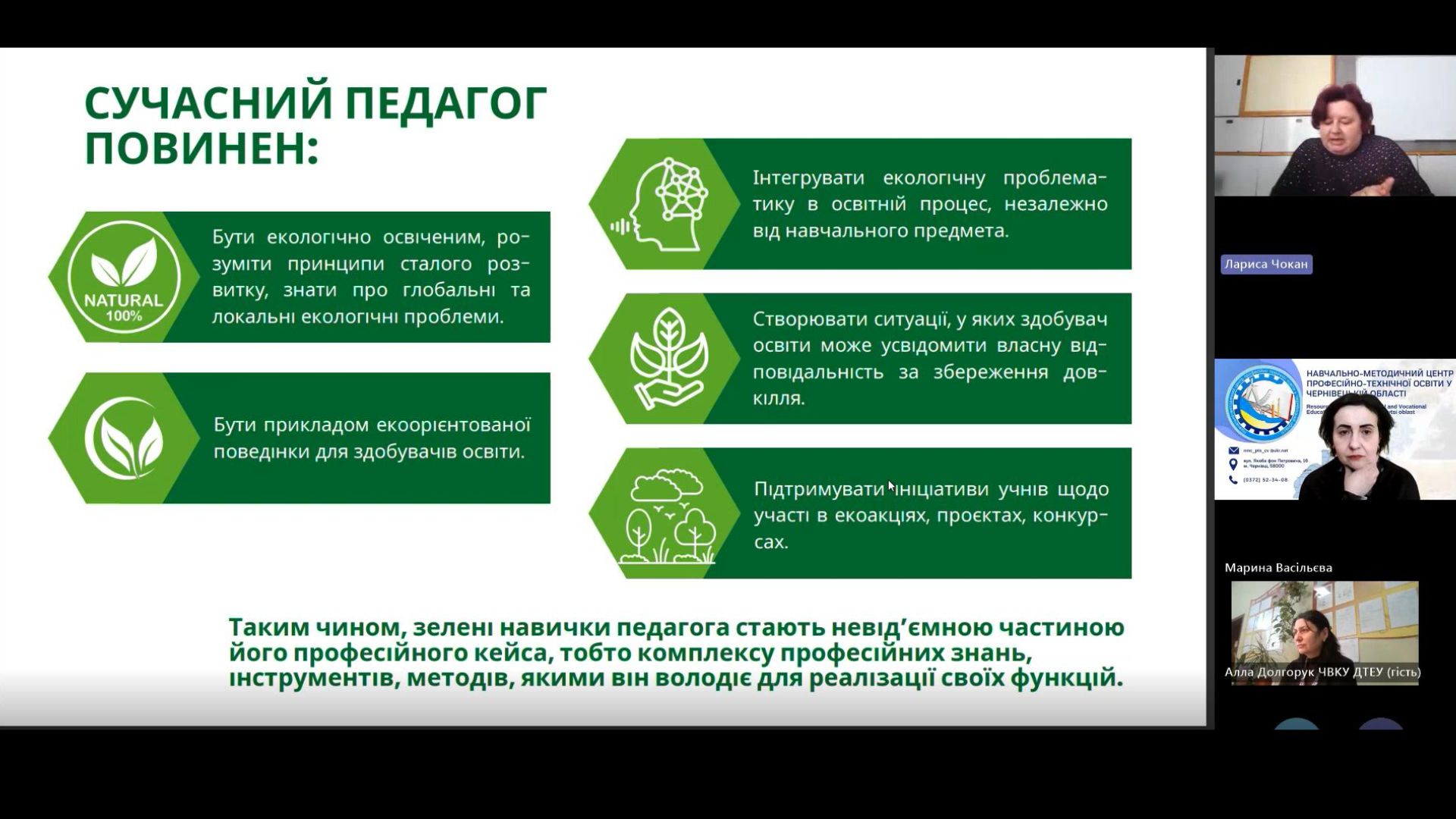 Лариса ЧОКАН, викладач хімії, біології та екології ВПУ №24 м. Заставна обгрунтувала роль педагога у формуванні зелених навичок під час вивчення біології та екології, адже саме поєднання знань, умінь та навичок дозволяють жити, працювати в гармонії з природою мінімізуючи негативний вплив на довкілля.