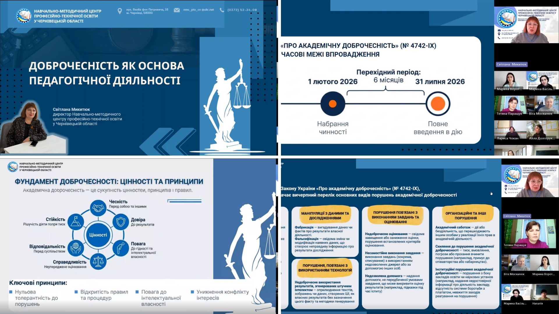 Розпочала засідання Світлана МИКИТЮК, директор Навчально-методичного центру професійно-технічної освіти у Чернівецькій області з висвітленням теми щодо дотримання основних принципів академічної доброчесності, які гарантують справжність та чесніть.