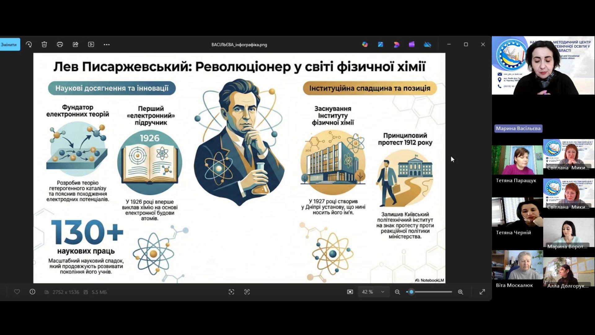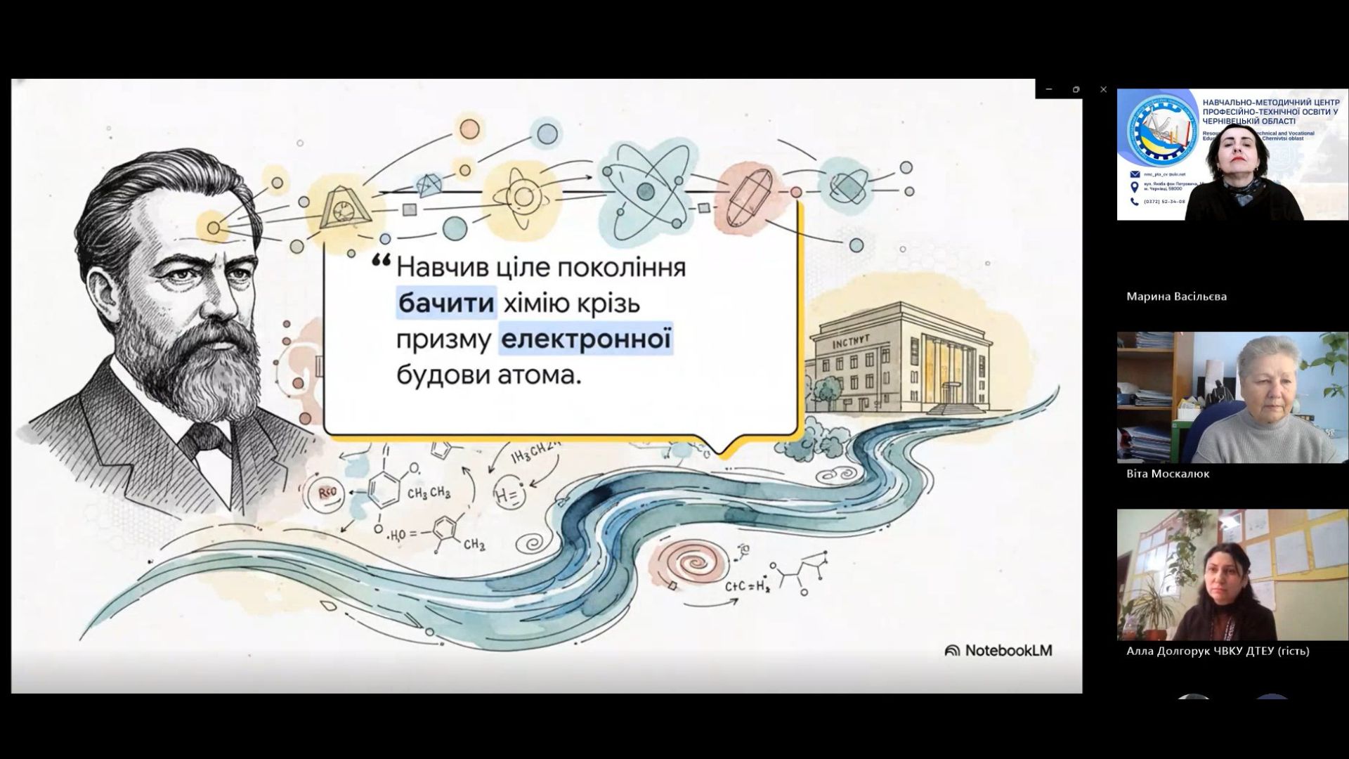 Марина ВАСІЛЬЄВА, методист Навчально-методичного центру професійно-технічної освіти у Чернівецькій області представила увазі присутніх демонстраційний матеріал про видатного українського вченого хіміка Лева Писаржевського. Такого роду презентації створюють міст між абстрактивними знаннями та реальним людським досвідом.