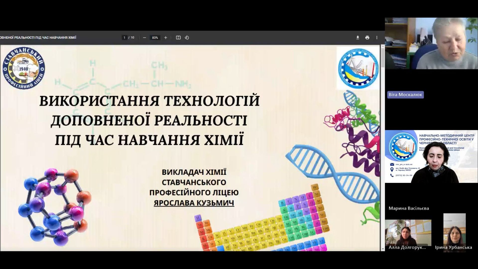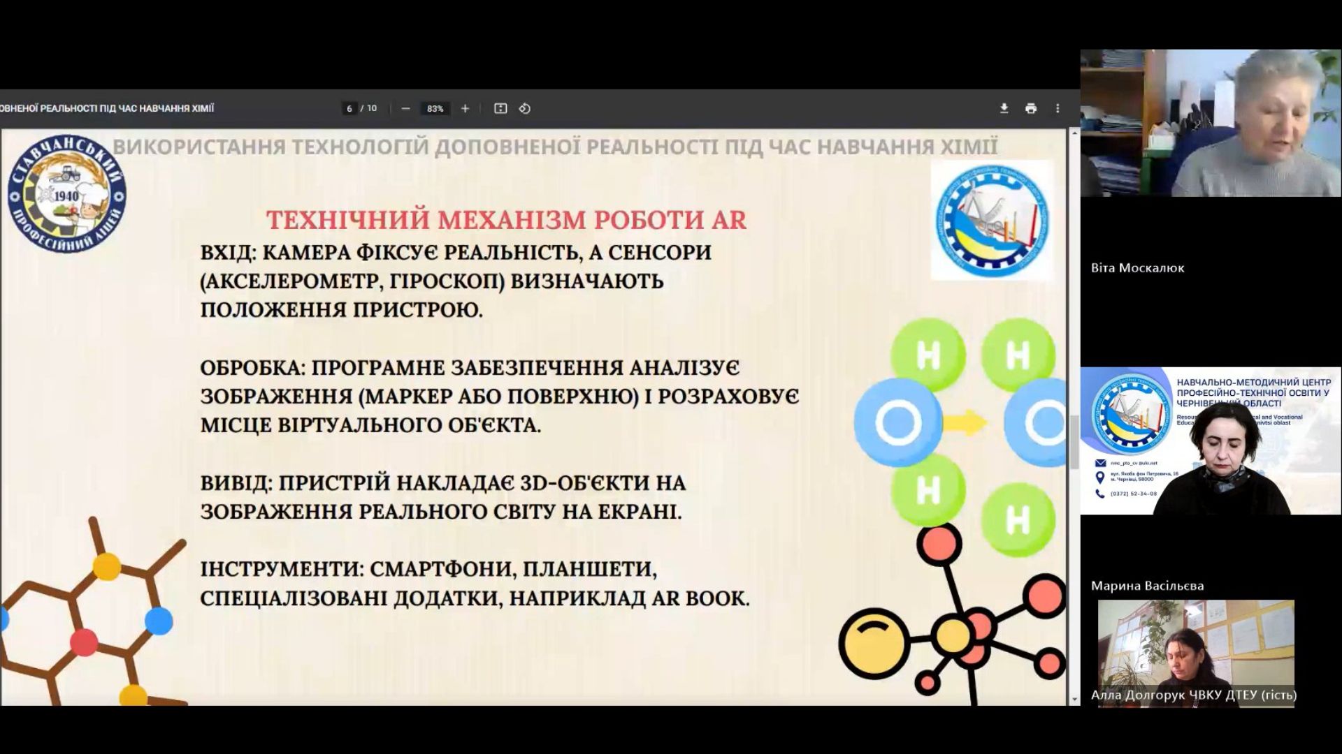 Ярослава КУЗЬМИЧ, викладач хімії СПЛ зосередила увагу присутніх колег на темі «Використання технологій доповненої реальності під час навчання з хімії», яка розкриває суть та способи подолання бар’єрів між теорією та реальним розумінням матеріалу.