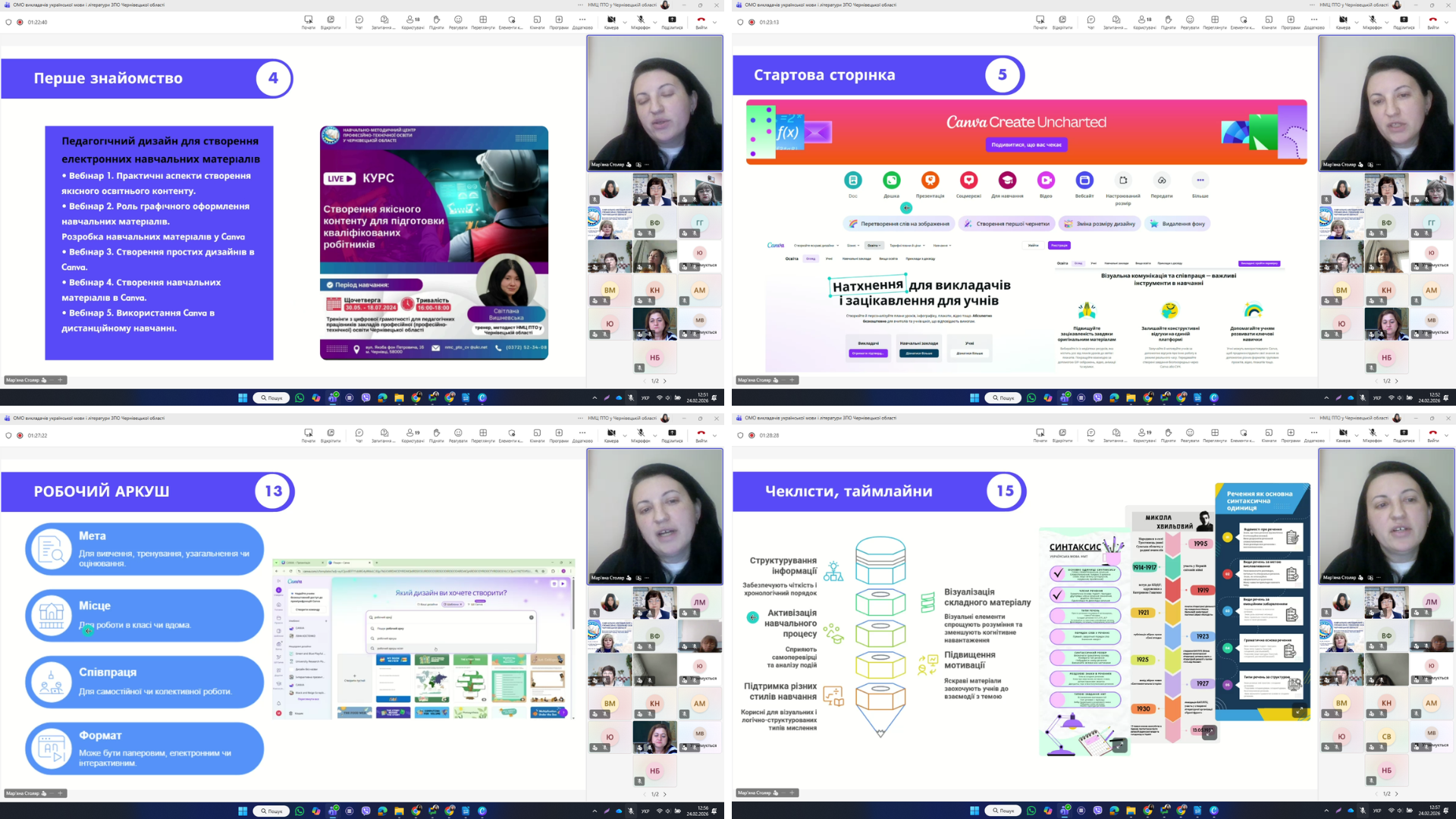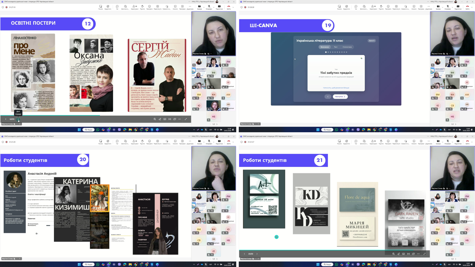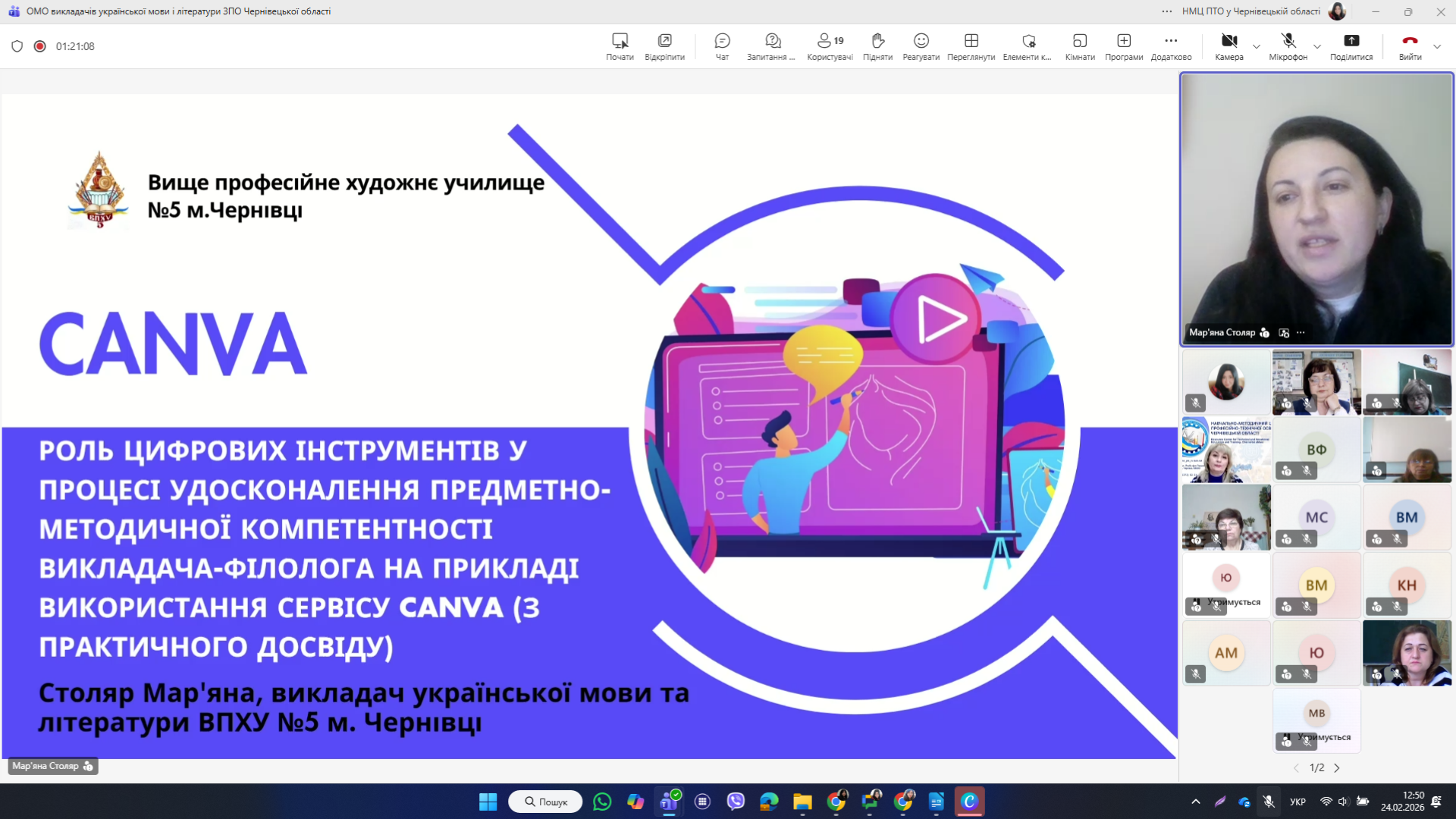 Роль використання цифрових інструментів у процесі удосконалення предметно-методичної компетентності викладача-філолога на прикладі використання сервісу Canva з переглядом відео-презентації представила заступник директора з навчально-виробничої роботи Вищого професійного художнього училища №5 м. Чернівці, викладач української мови і літератури Мар’яна СТОЛЯР.