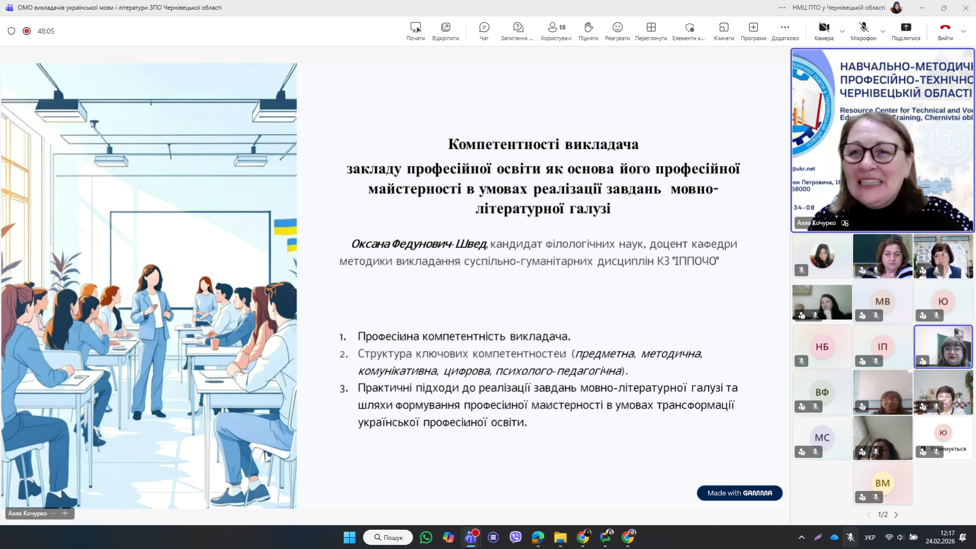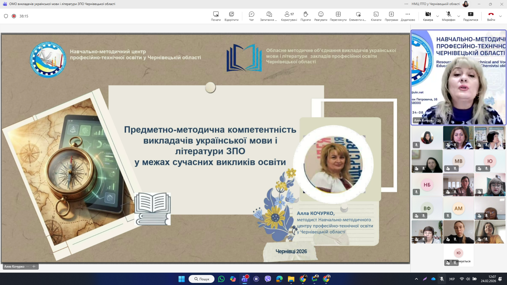 Засідання розпочалося з висвітлення теми предметно-методичної компетентності викладачів української мови і літератури ЗПО у межах сучасних викликів освіти, яку презентувала методист НМЦ ПТО у Чернівецькій області Алла КОЧУРКО.