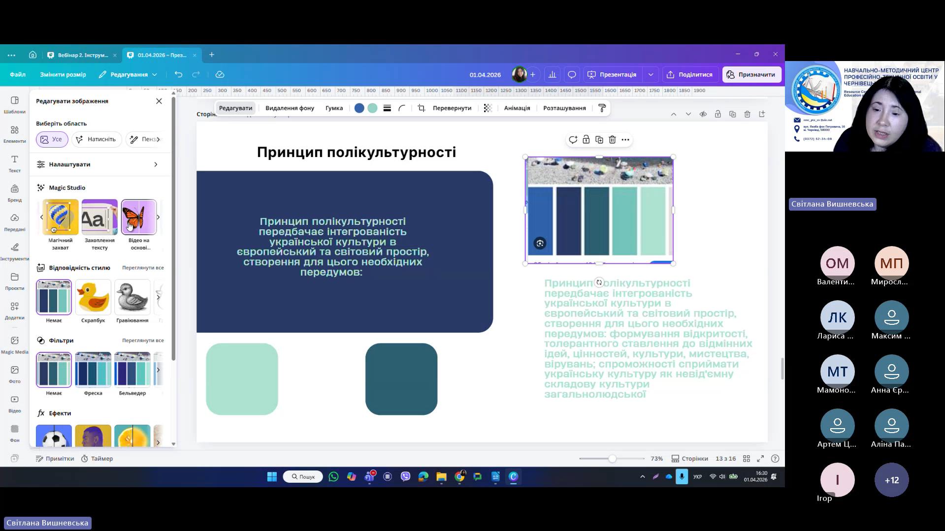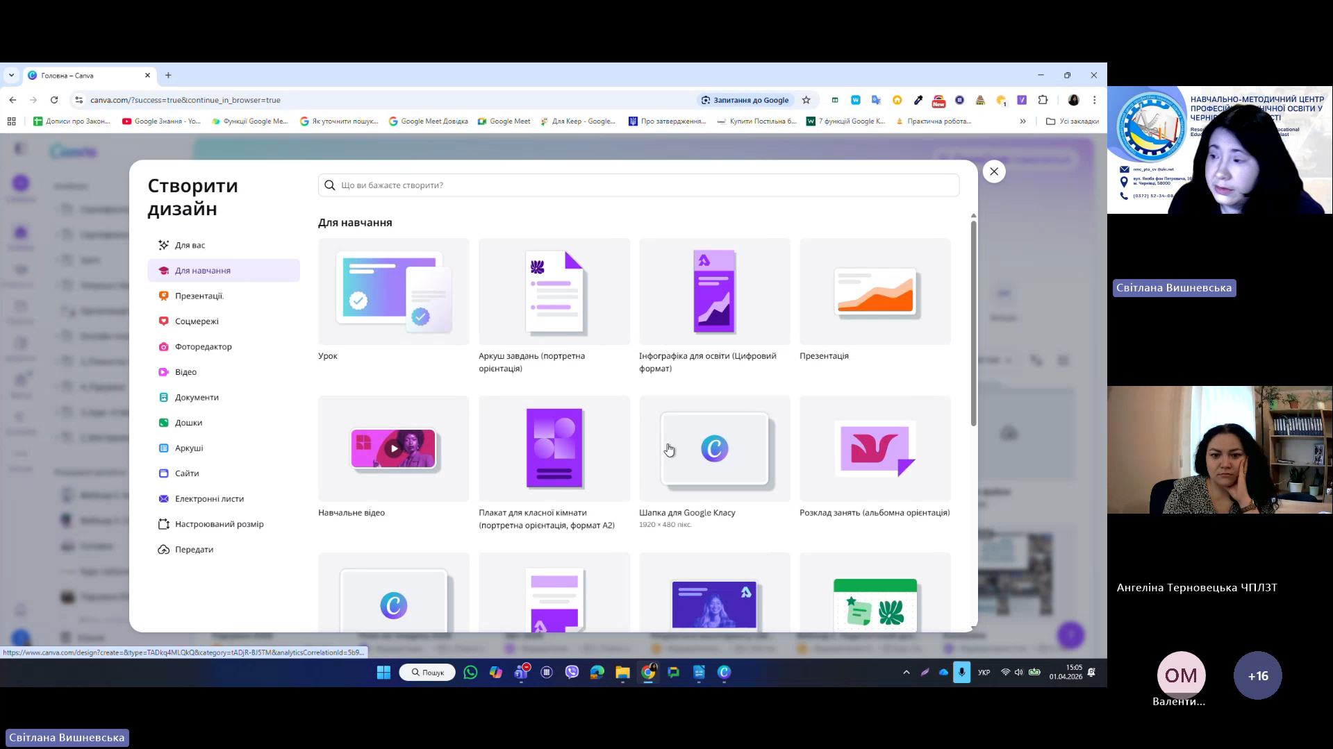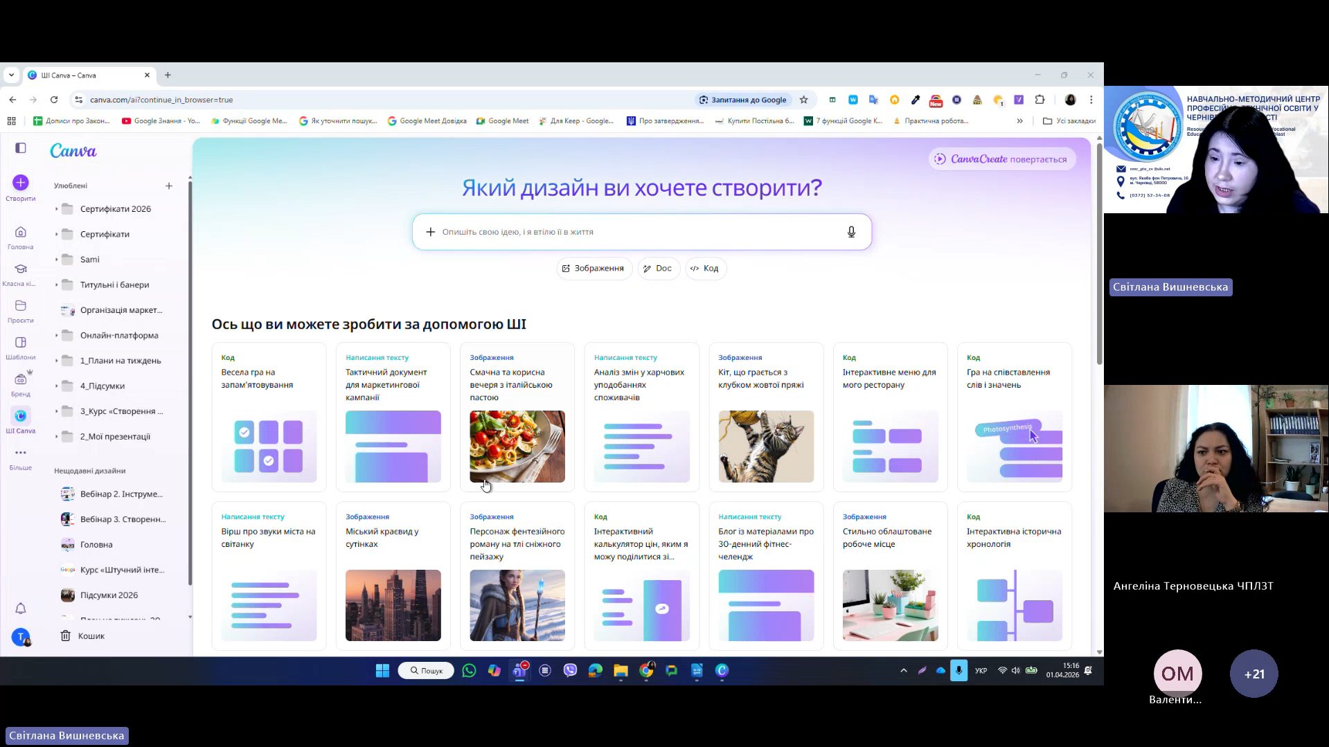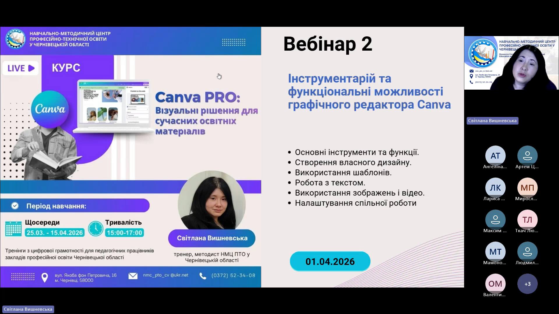 1 квітня 2026 року відповідно до плану роботи Навчально-методичного центру професійно-технічної освіти у Чернівецькій області на 2026 рік та програми курсу «𝗖𝗮𝗻𝘃𝗮 𝗣𝗥𝗢: Візуальні рішення для сучасних освітніх матеріалів», відбувся черговий вебінар для педагогічних працівників ЗПО. Під час вебінару Світлана Вишневська, методист Центру, познайомила слухачів з особливостями створення простих дизайнів у Canva. В межах Вебінару 2 педагогічні працівники:
