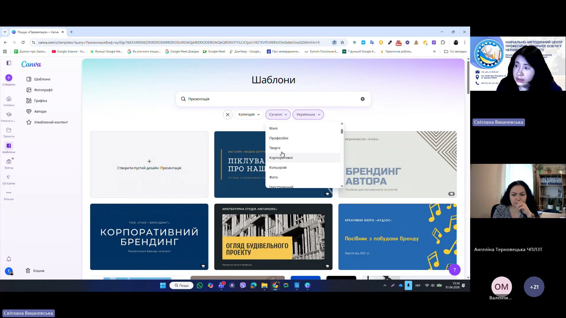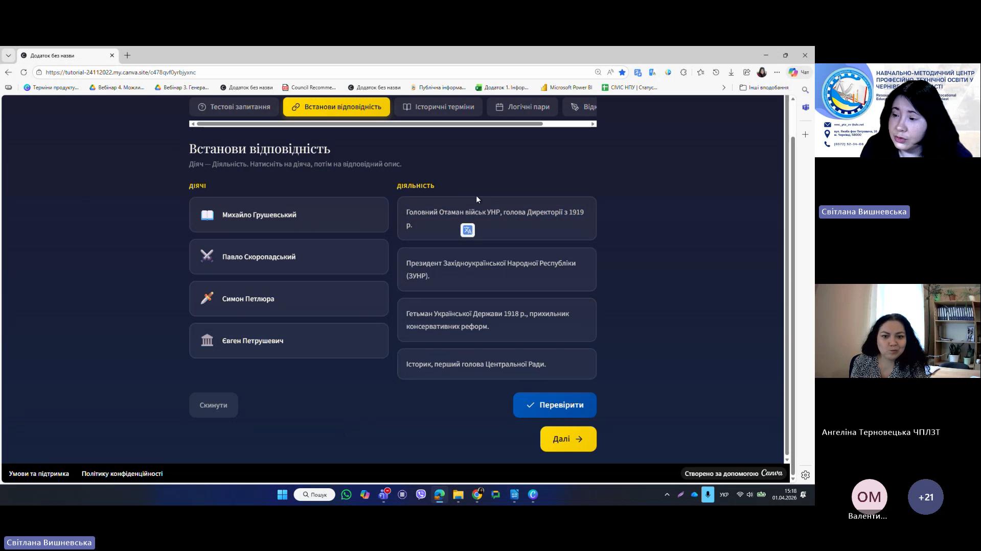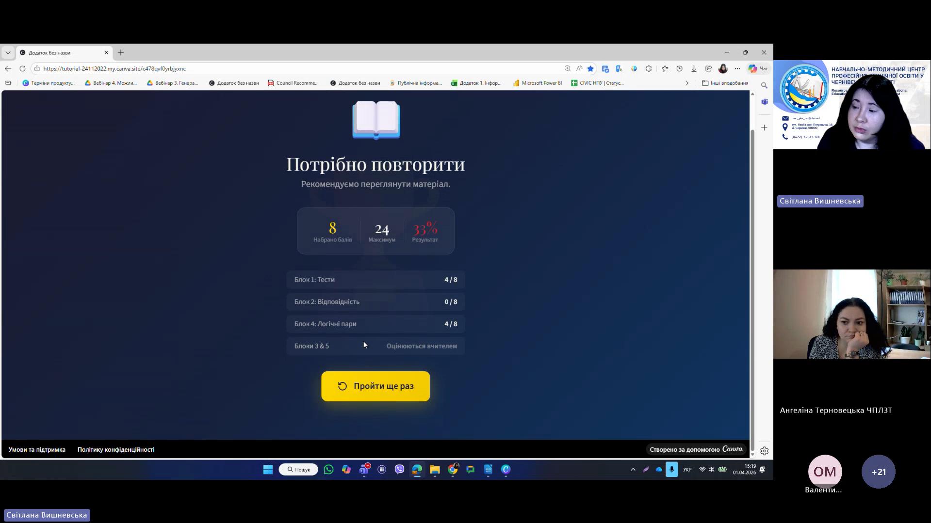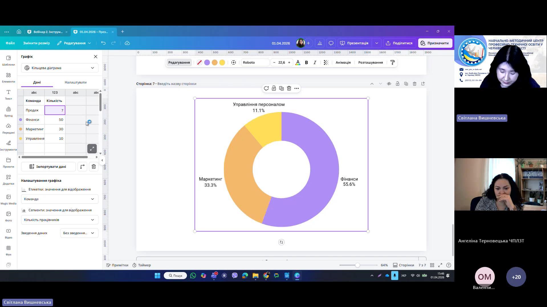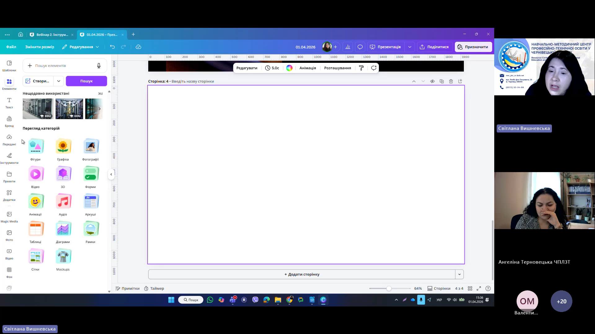 1 квітня 2026 року відповідно до плану роботи Навчально-методичного центру професійно-технічної освіти у Чернівецькій області на 2026 рік та програми курсу «𝗖𝗮𝗻𝘃𝗮 𝗣𝗥𝗢: Візуальні рішення для сучасних освітніх матеріалів», відбувся черговий вебінар для педагогічних працівників ЗПО. Під час вебінару Світлана Вишневська, методист Центру, познайомила слухачів з особливостями створення простих дизайнів у Canva. В межах Вебінару 2 педагогічні працівники: