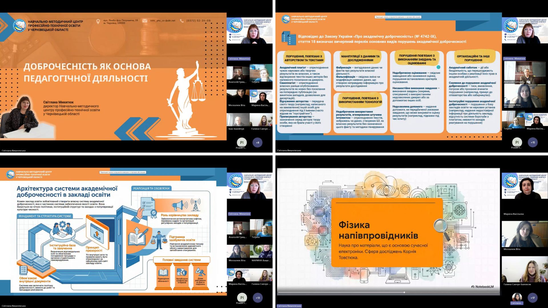 Розпочалося засідання з зверненням до присутніх Світлани МИКИТЮК, директора Навчально-методичного центру професійно-технічної освіти у Чернівецькій області з висвітленням теми, щодо дотримання основних принципів академічної доброчесності, адже дотримання академічної доброчесності є фундаментальною основою якісної освіти та наукової діяльності, що забезпечує довіру до результатів навчання, розвиває критичне мислення та формує професійну етику.