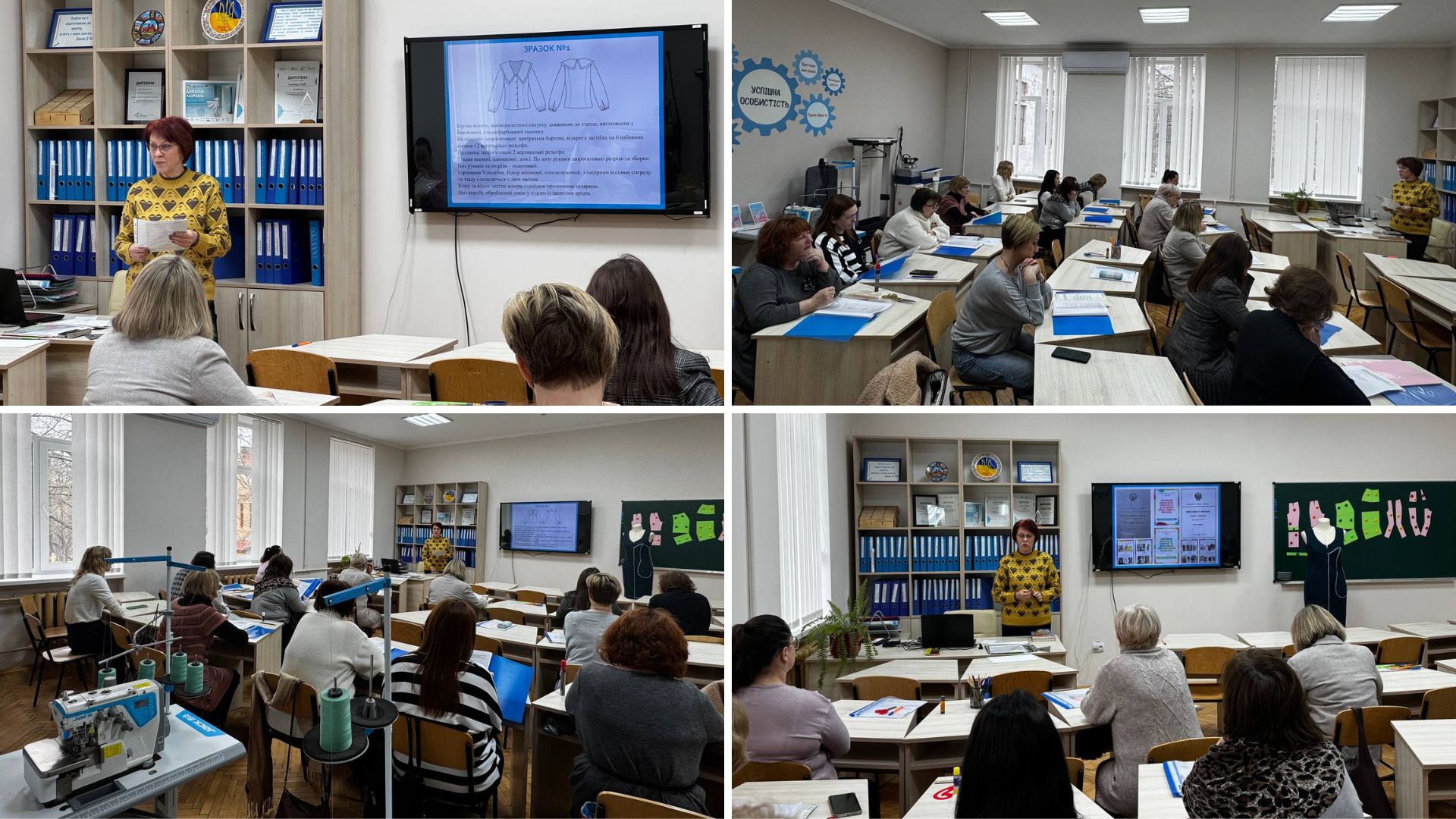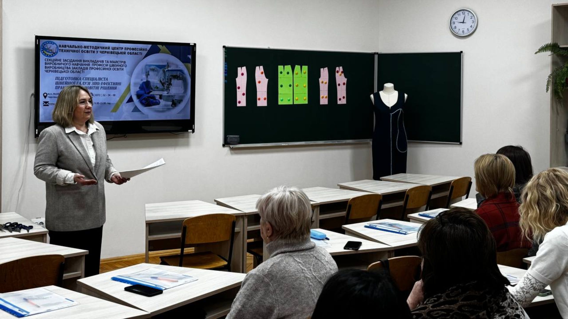 Людмила Берегій, голова обласної методичної секції педагогічних працівників швейної індустрії, викладач спеціальних дисциплін ВПУ № 3 м. Чернівці, провела навчальний практикум «Опис швейних виробів мовою стандартів», розкривши методичні підходи до професійного опису виробів відповідно до нормативно-технічної документації, структури опису, термінології та уніфікації документації.