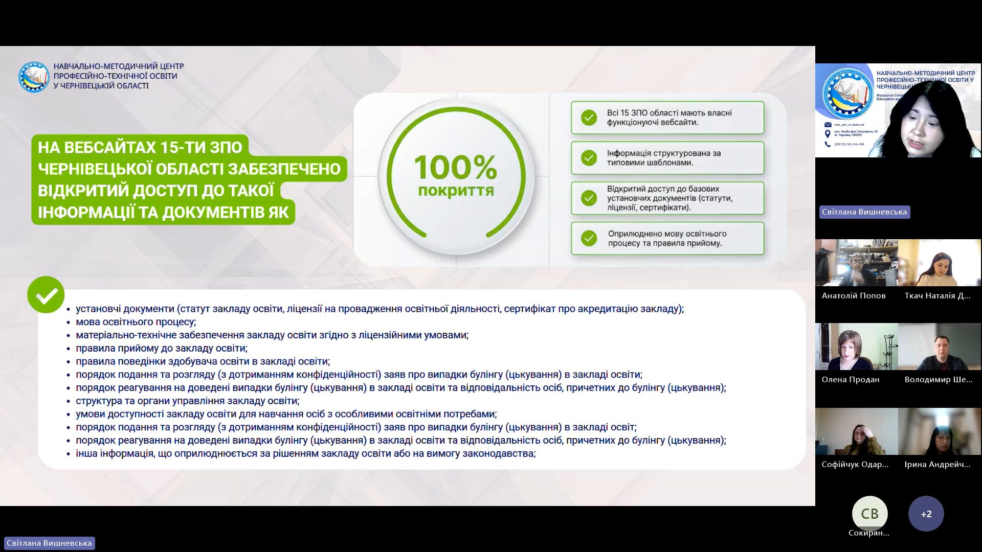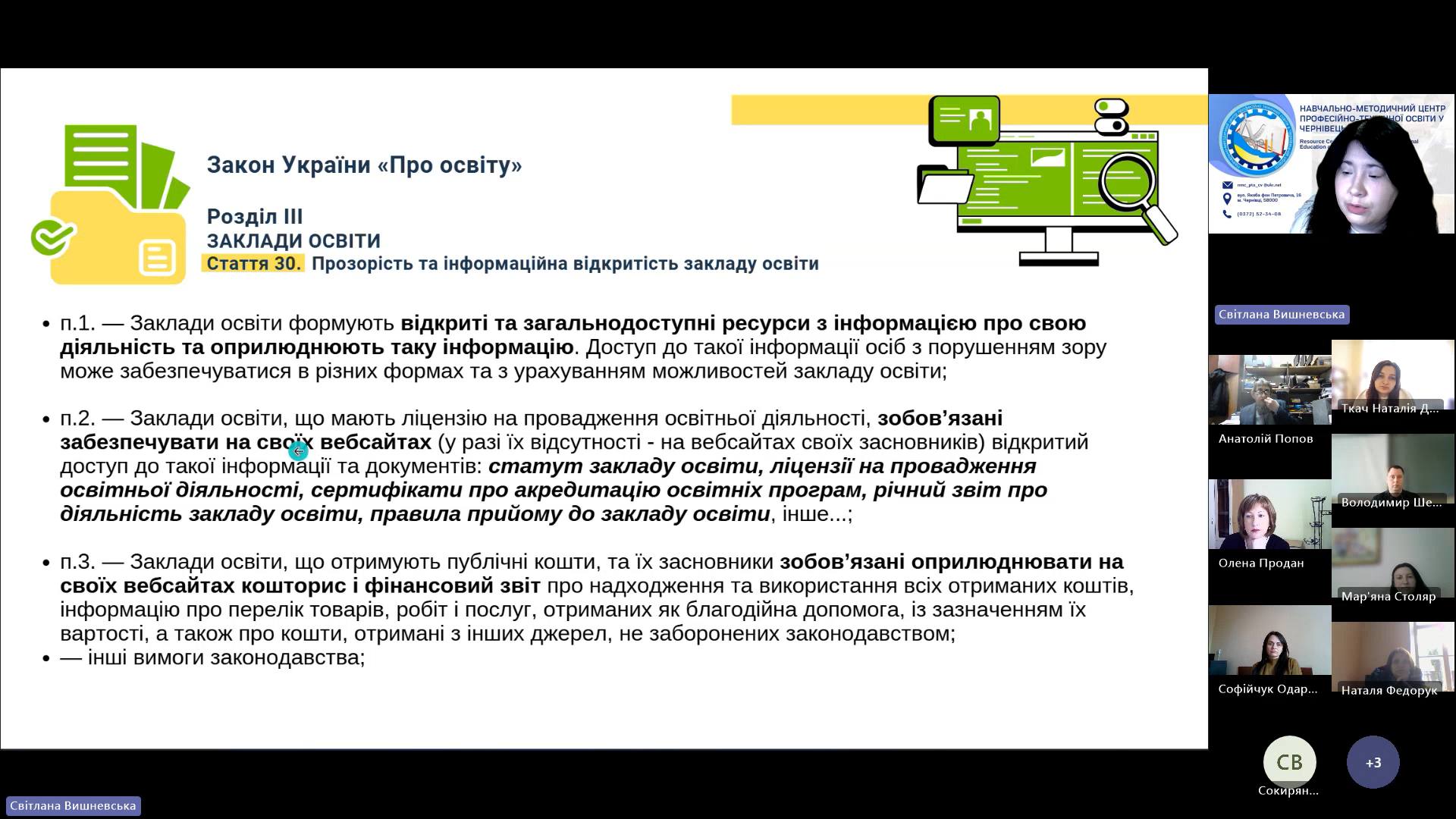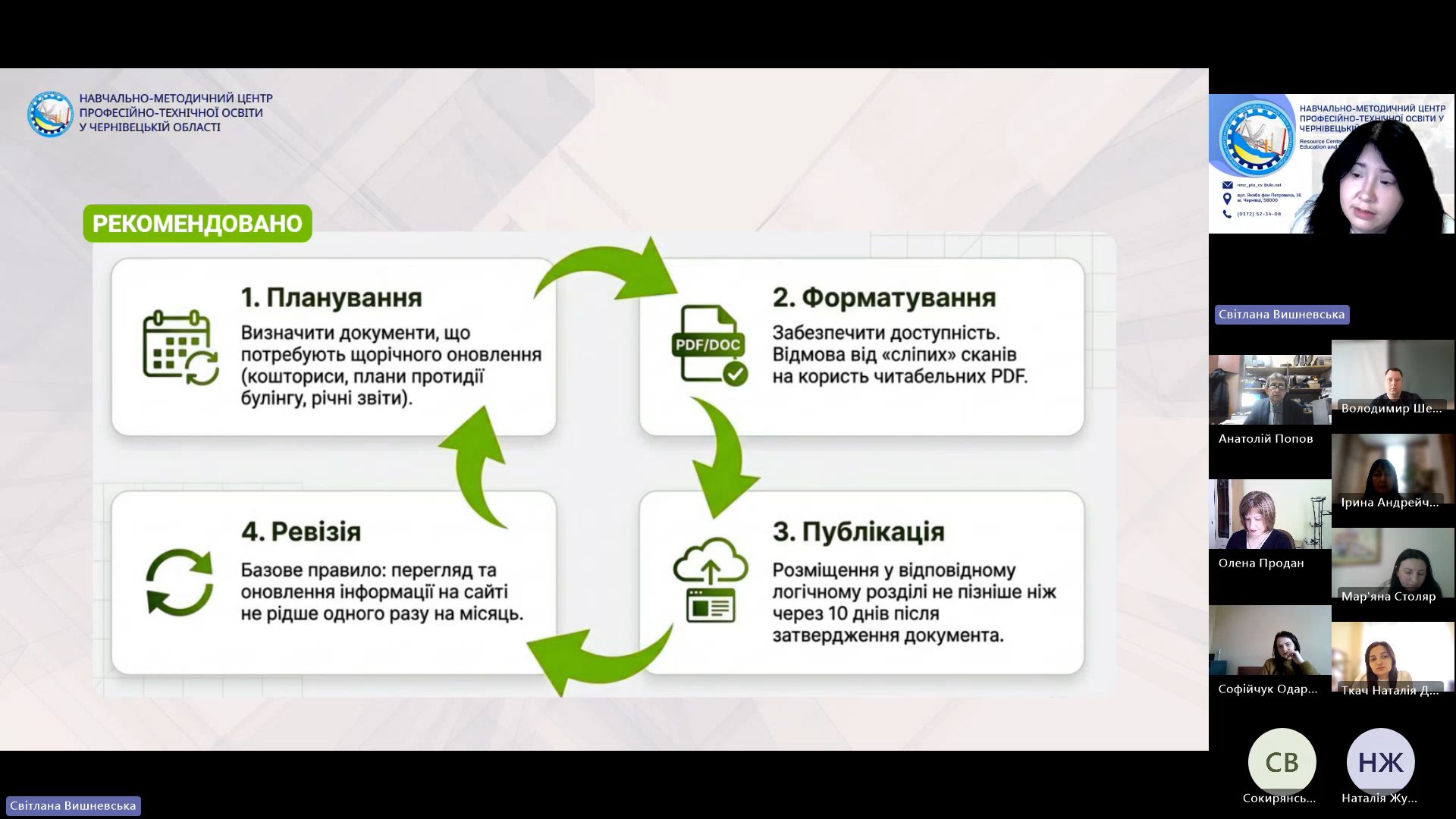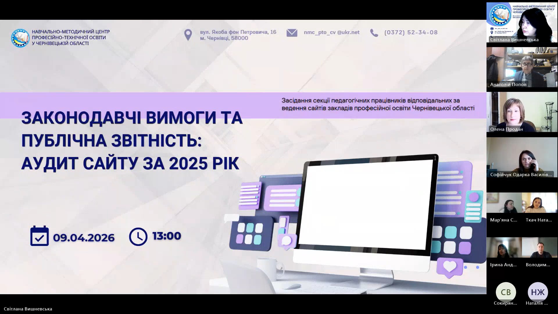 9 квітня 2026 року відповідно до плану роботи Навчально-методичного центру професійно-технічної освіти у Чернівецькій області на 2026 рік, відбулося засідання секції педагогічних працівників, відповідальних за ведення сайтів закладів професійної освіти Чернівецької області присвячене темі: «Законодавчі вимоги та публічна звітність: аудит сайту за 2025 рік».