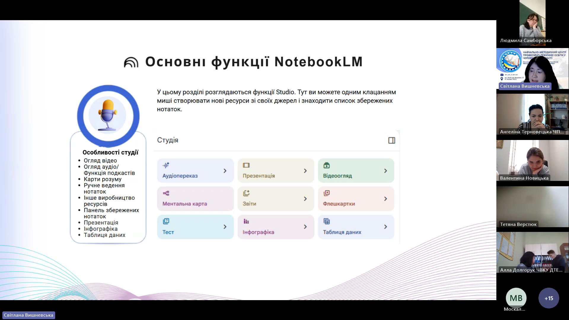 Під час вебінару Світлана Вишневська, методист Центру, продемонструвала учасникам, як за допомогою технологій штучного інтелекту можна оптимізувати процес підготовки освітніх матеріалів, розробки контенту та навіть персоналізації навчання. В межах Вебінару педагогічні працівники: